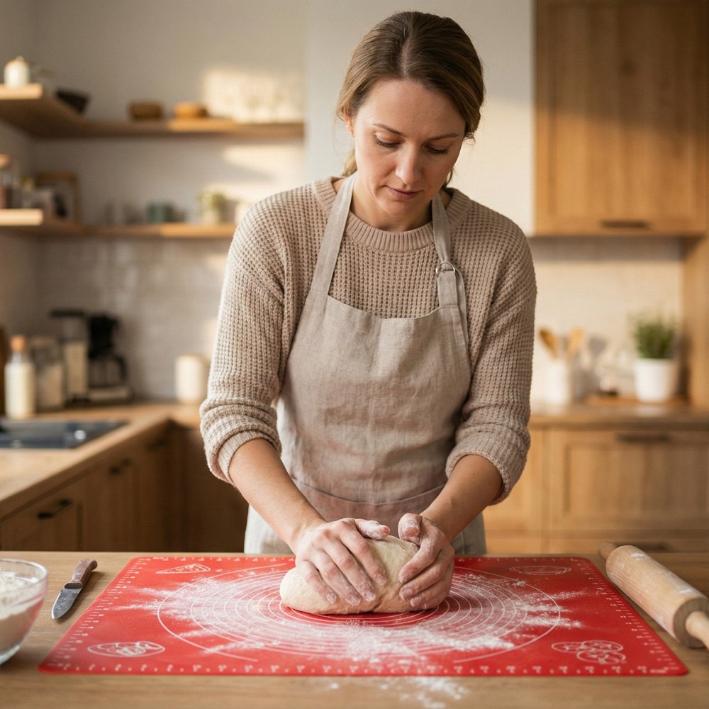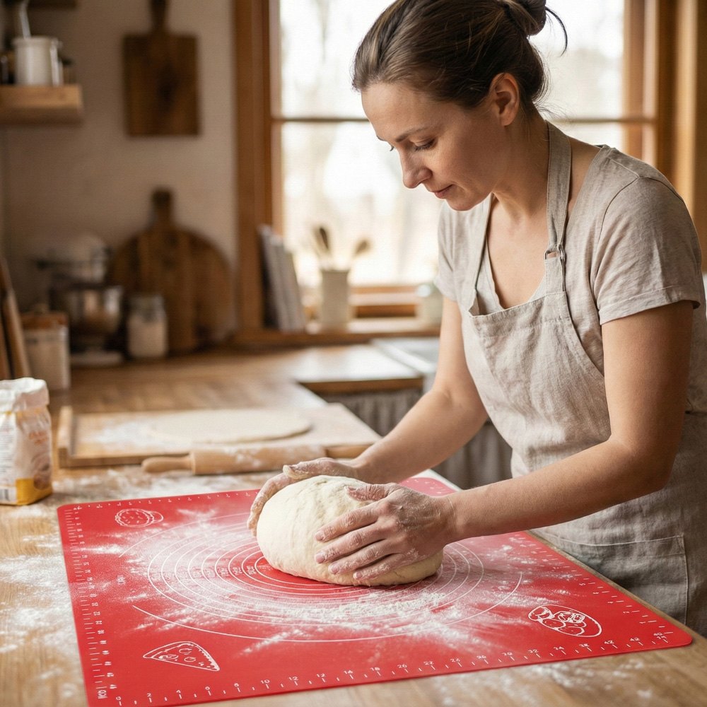 Silikoninė darbo lenta sujungia tradicinės darbo paviršiaus funkcionalumą su moderniais sprendimais. Medžiaga pasižymi elastingumu išlaikant stabilumą dirbant. Neslystantis pagrindas užtikrina sukibimą su virtuvės stalviršiu, pašalindamas nepageidaujamą slydimą kočiojant tešlą.